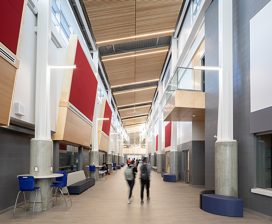 Upon entering All Saints High School, you immediately get the feeling that you’ve stepped into the heart of the community. Spirit, Mind, and Body are all unified, symbolized by the suspended chapel, library, and gymnasium. This central location also establishes a visual link to all three wings of the school, fostering a sense of unity and safety.