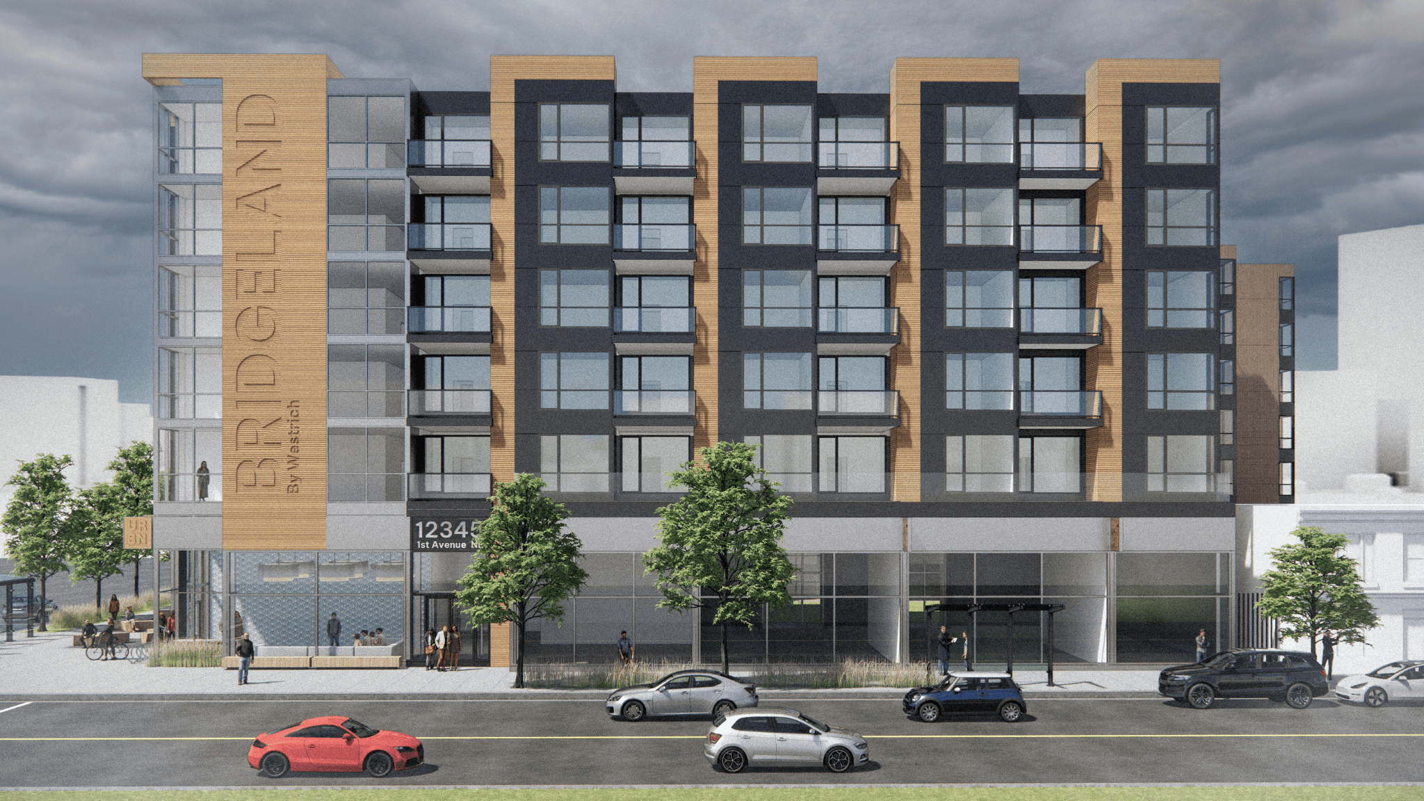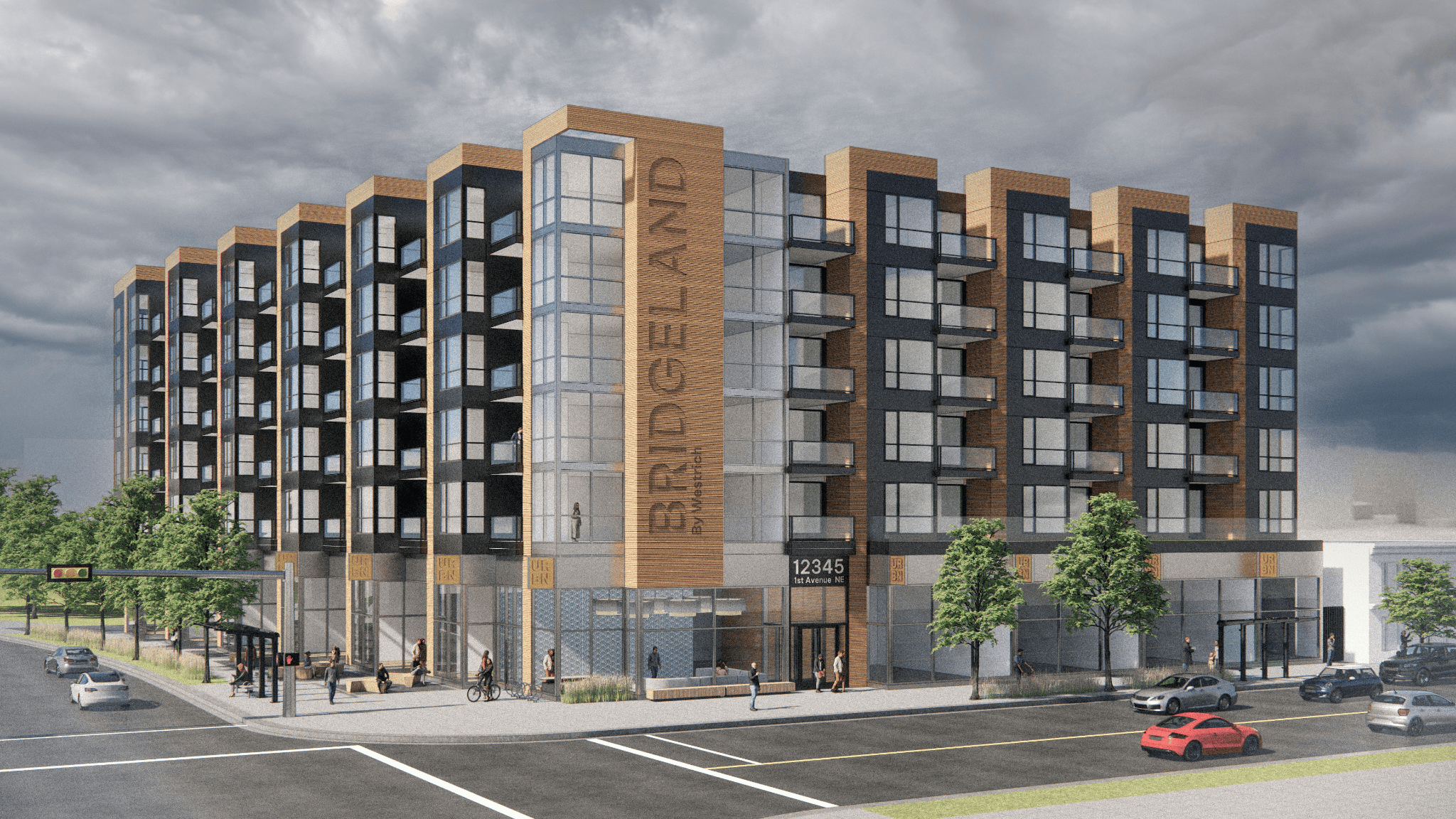 The Bridgeland multi-family project is situated in the heart of the rapidly developing Bridgeland community, which is experiencing significant redevelopment and urban renewal. Positioned on a prominent corner lot, the building features a stepped design that complements the natural landscape. This thoughtful architectural approach enhances the streetscape and creates a dynamic relationship with the nearby heritage building, honouring its historical significance while contributing to the contemporary growth of the neighbourhood.