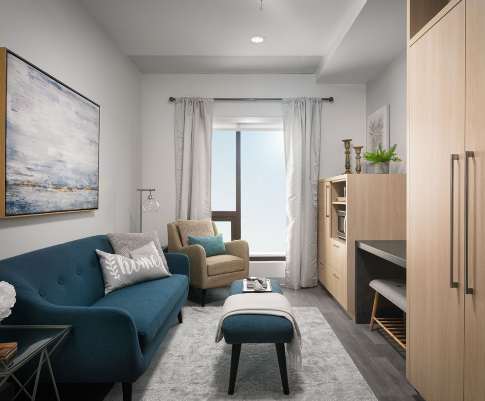 This project features a research center dedicated to the study of aging. The community acts as a ‘living lab,’ and it seamlessly blends living, learning, and health services to enhance the quality of life for senior residents. In addition, the project offers home care services, programs, and amenities designed to cater to the needs of those residing in the adjacent 55+ independent living condominium building. This building was thoughtfully designed to include a convenient plus-30 pedway connection, making it easier for both structures’ residents to interact and share amenities.