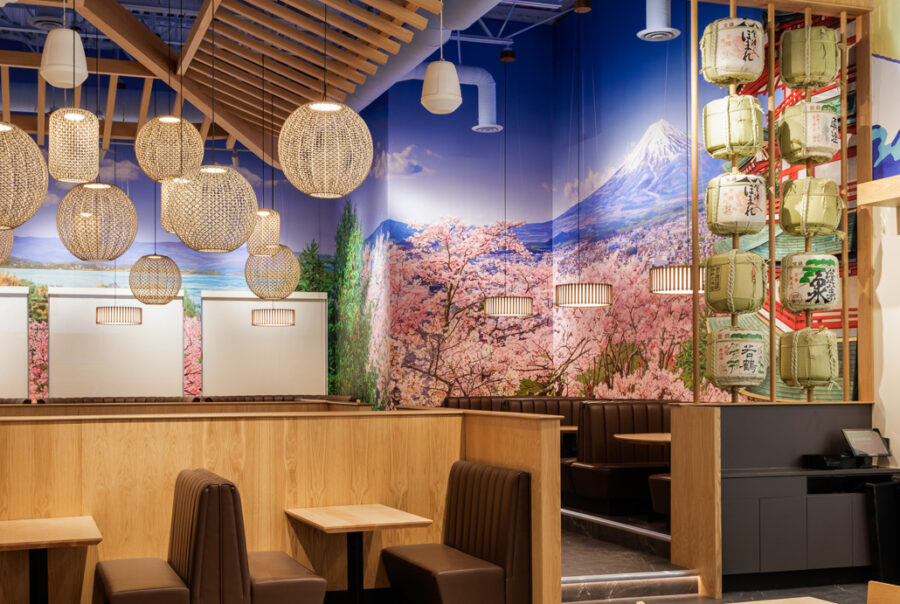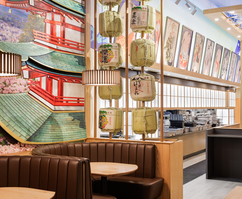 The restaurant’s design blends traditional and contemporary Japanese elements. One side reflects traditional Japan with iconic features like the Chureito Pagoda and a Mount Fuji backdrop, while the market side showcases the vibrancy of modern Japan through its decor, including a temple-inspired wooden ceiling and sake barrel partitions.