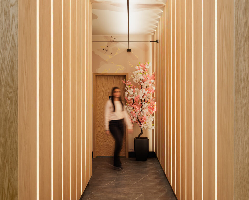 The central dining area showcases a cherry blossom tree that extends into a sculpted metal ceiling, combining elements of nature and architecture for a distinctive atmosphere. The expanded dining area features green walls and Shoji columns, which enhance the immersive experience. As guests move toward the washrooms, they are guided by illuminated wall slats and graphics of Samurai and Geisha. The unisex washrooms are designed with Kintsugi-inspired tiles and Wagasa-shaped light fixtures.