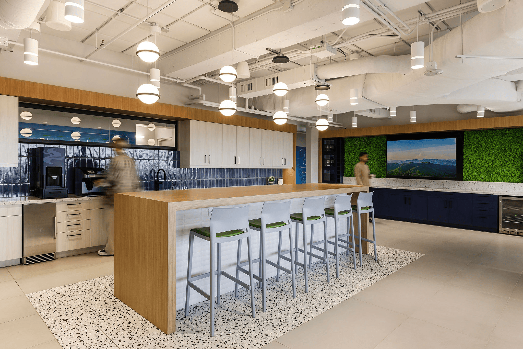 Nature is brought indoors through moss walls in brand colours and lush greenery in the reception and breakroom areas. The breakroom also expands into an entertainment space when needed.