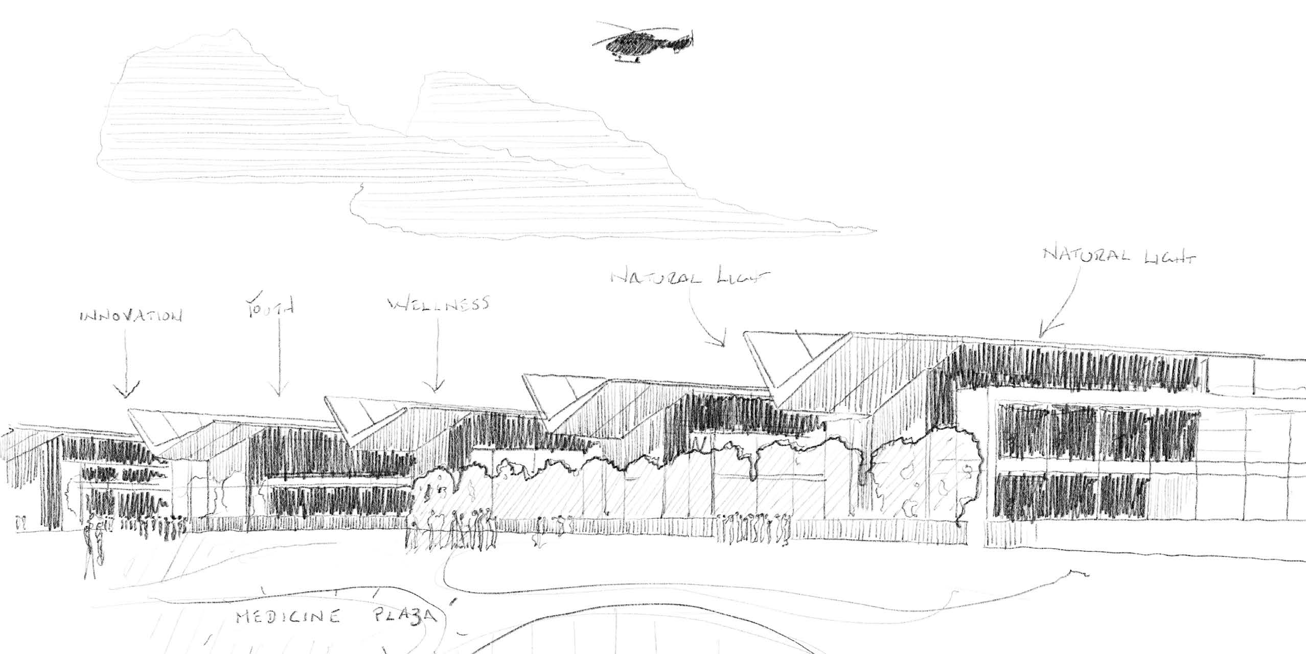 The overarching theme guiding the design of the Siksika Health Campus is centred around the meaningful integration of Traditional First Nation Medicine with Western Medicine. The design includes six programmatic wellness components: the Elders Lodge, Acute Care, Youth Services, the existing Health and Wellness Centre, the Innovation Centre, and Tri-services. These components are arranged around the seventh and central wellness element, Traditional Healing. Together, they form a powerful symbolic and physical connection, further enriched by two landscape features: the ‘Elders Pathway’ and the ‘Children’s Trail.’