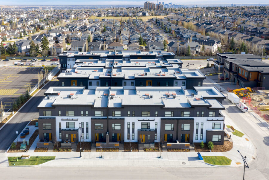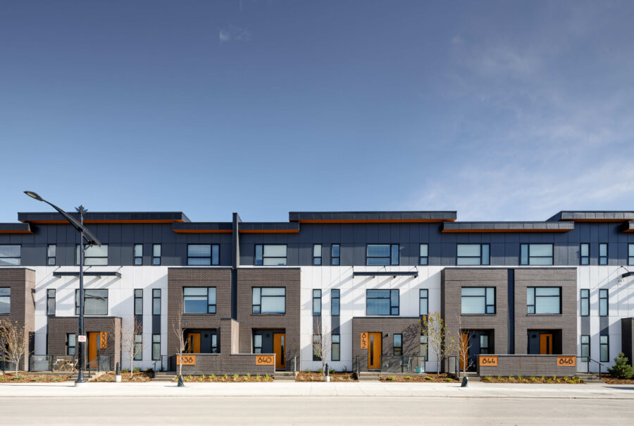 This three-storey townhome development project is located in Calgary’s newest master-planned community, West District, and comprises 34 luxury units spread across four contemporary buildings. The front door access features a minimal setback, seamlessly connecting residents to the community’s pathways, streets, and courtyard.