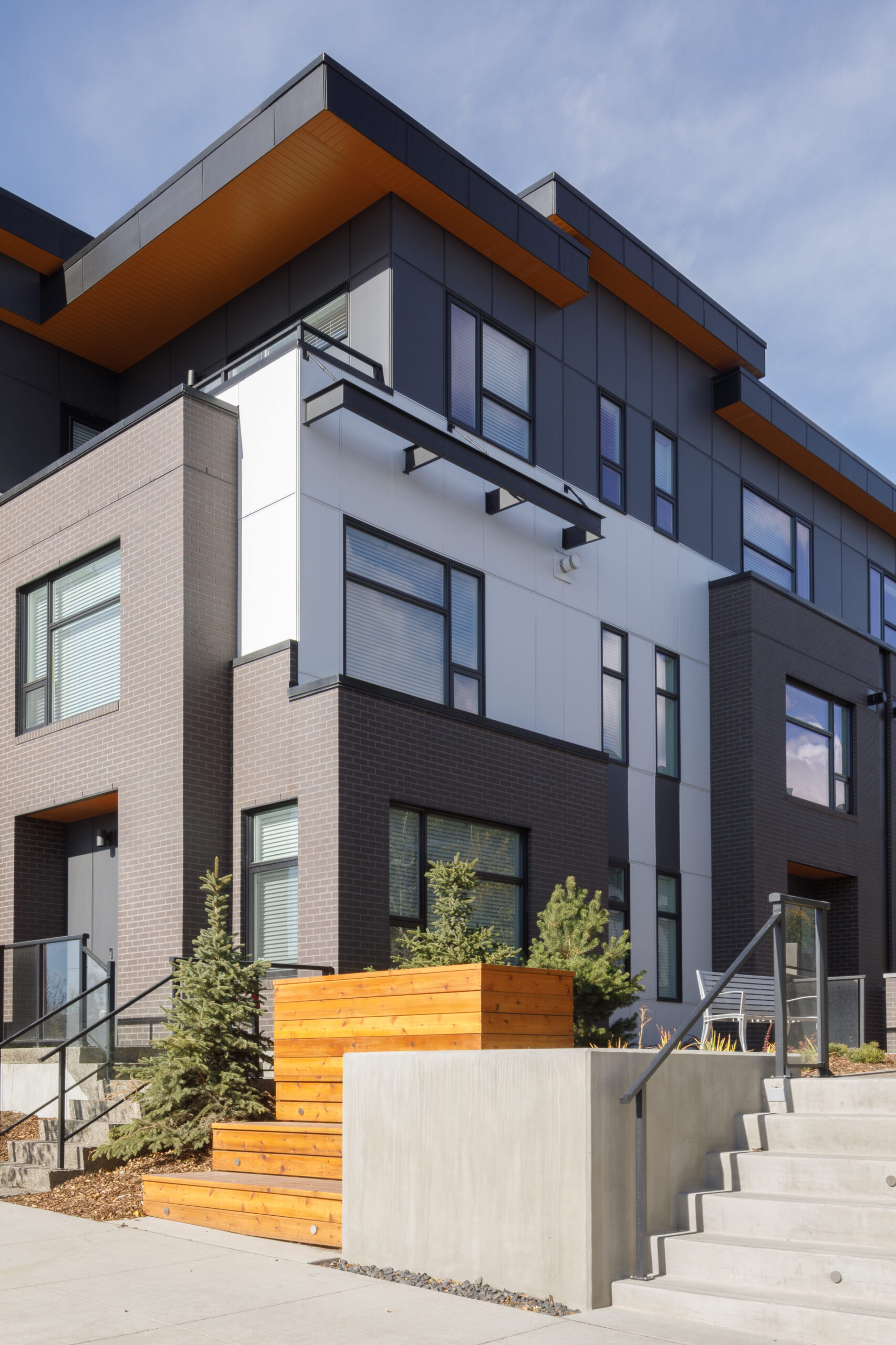 The building’s architecture is characterized by fibre-reinforced cementitious panels that explore shades of white and black. A touch of wood grain panels has been incorporated into the patios, soffits, and doors to create a warm, natural element.