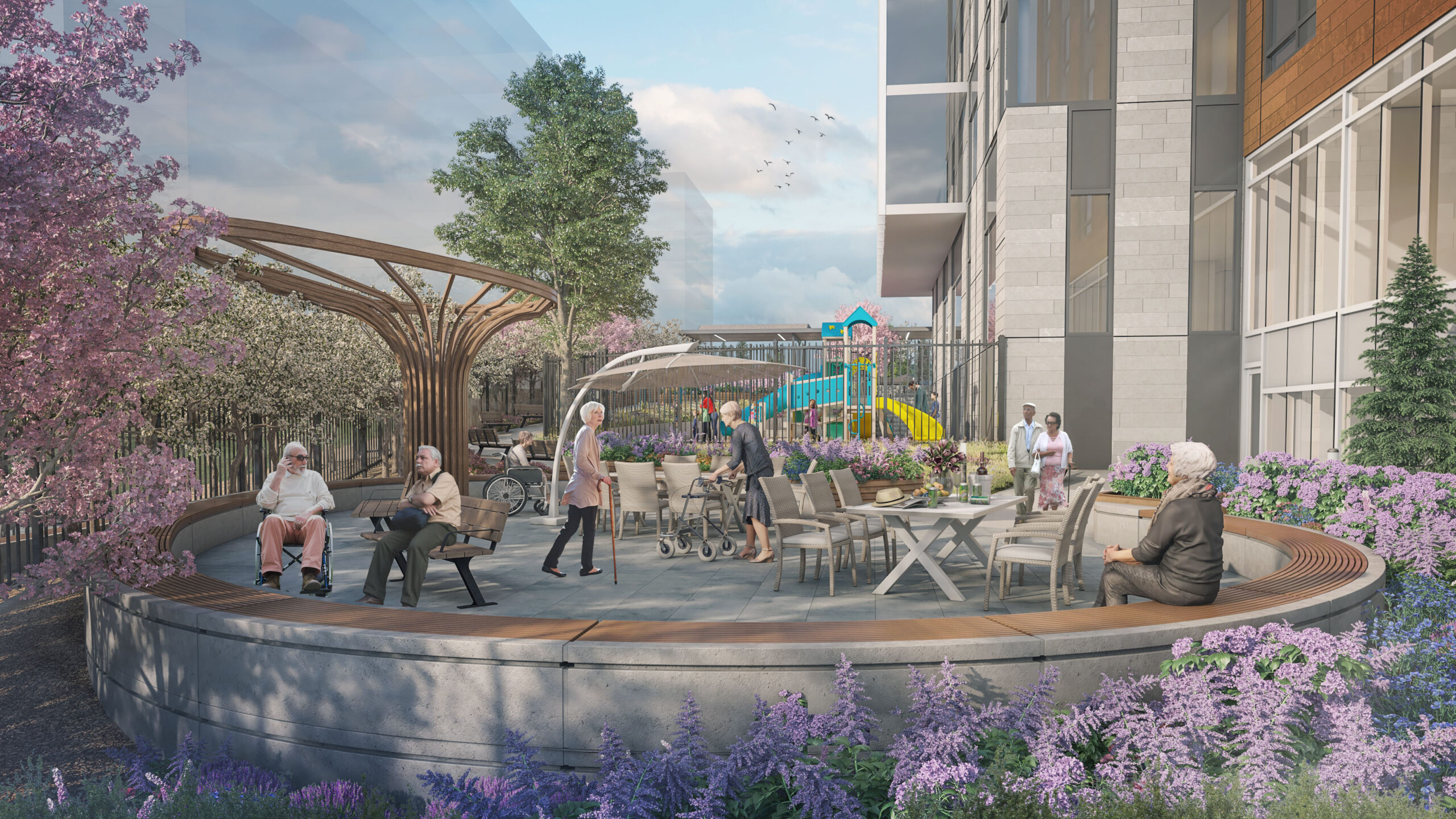 Phase 1 of the project focuses on designing a 6-storey, 207-unit long-term care seniors facility. Tailored to individuals with complex care needs, reduced physical function, impaired cognition/memory loss, and special rehabilitation requirements, the design prioritizes enhancing the quality of life, emphasizing accessibility and prioritizing community interaction by incorporating elements like community gardens and separate entrances. The inclusion of a dedicated daycare facility with a separate entrance not only serves the needs of the community but also fosters an environment of inclusivity and intergenerational connection, enriching the overall experience for residents and visitors alike.